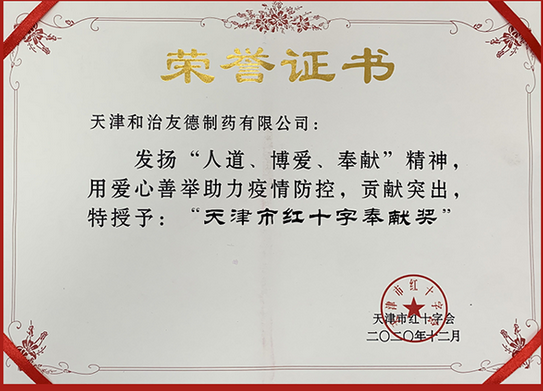 (和治友德“天津市红十字奉献奖”荣誉证书)